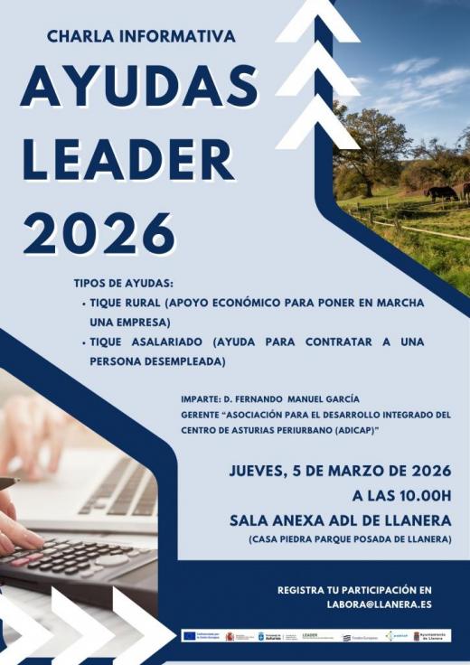 El jueves 5 de marzo de 2026 a las 10.00 horas tendrá lugar una Charla Informativa sobre las Ayudas Leader 2026 en la Sala Anexa a la Agencia de Desarrollo Local de Llanera (Casa Piedra, Parque de Posada de Llanera).