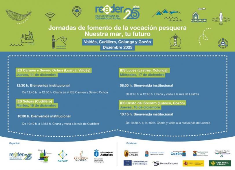Durante el mes de diciembre se llevarán a cabo las Jornadas de fomento de la vocación pesquera en Asturias organizadas por la Red Asturiana de Desarrollo Rural (READER) junto con la Dirección General de Pesca Marítima del Principado de Asturias y la Federación de Cofradías de Pescadores de Asturias.